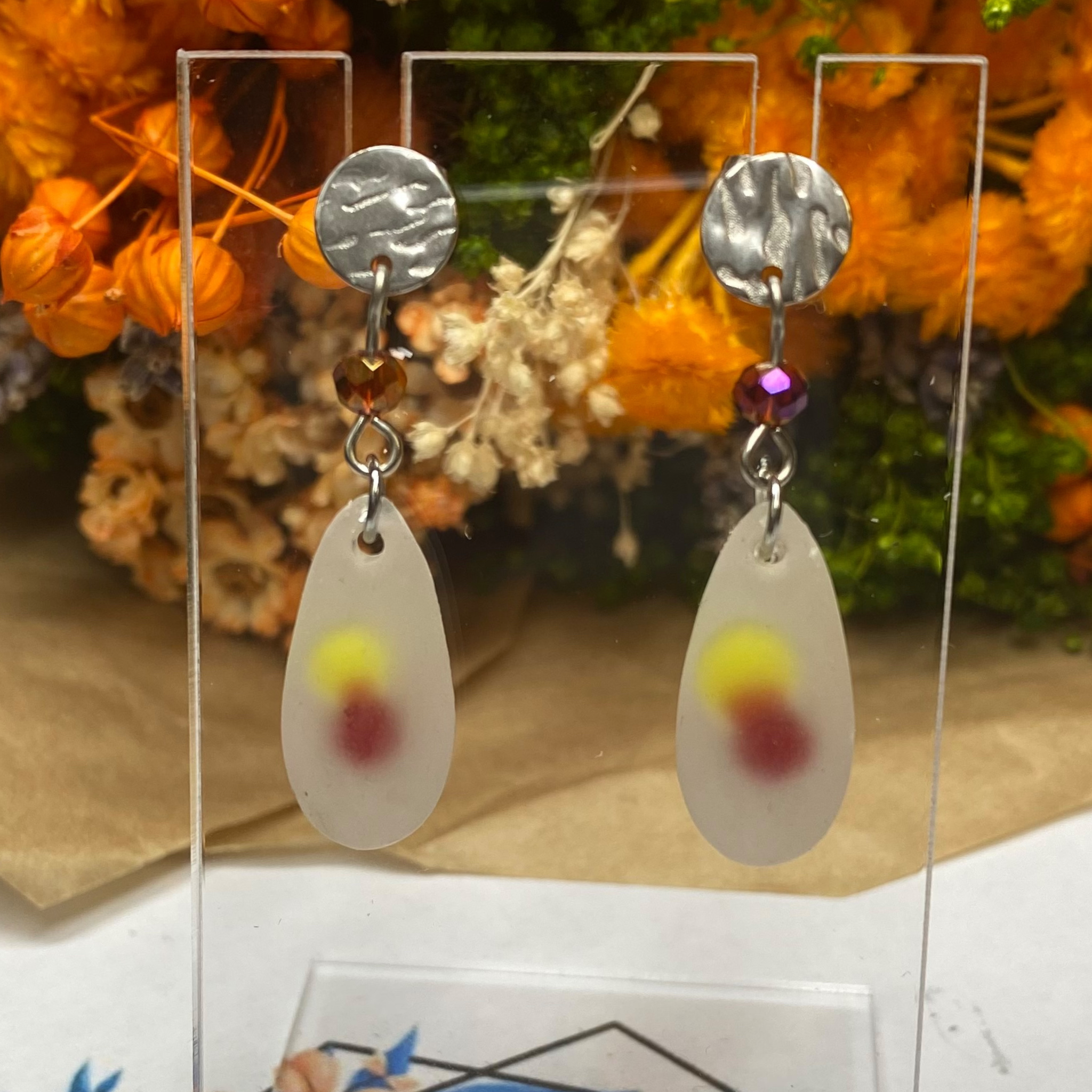 Orecchini con monachella in acciaio con al centro un cristallo rosso iridiscente e pendente in resina opaca a forma di goccia dal design interno di due bolle arancio e giallo per un effetto bubble.