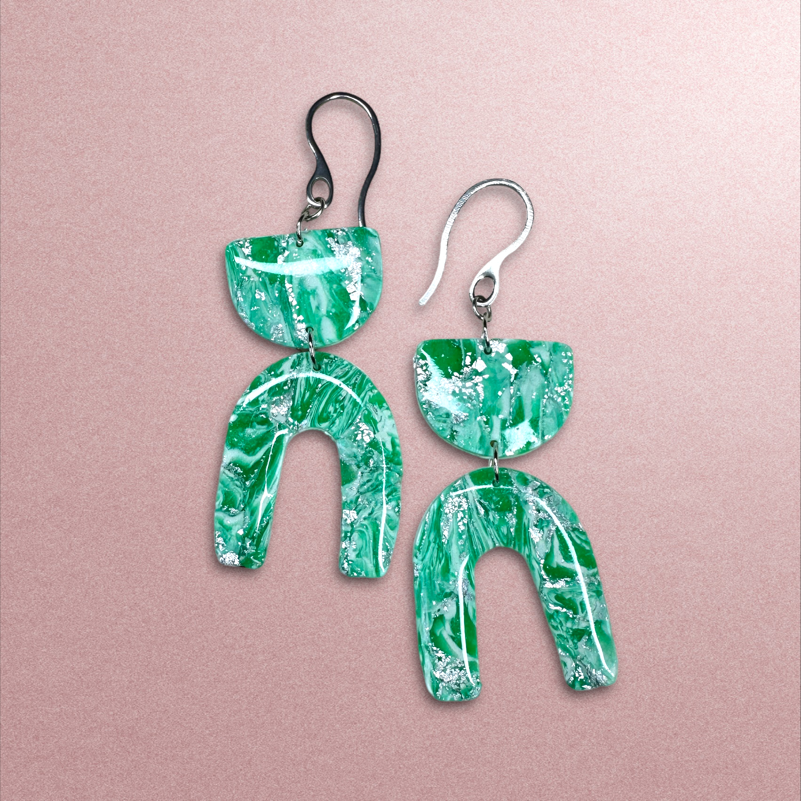 Orecchini stile Esagono dalle sfumature verde/argento realizzati a mano in argilla polimerica e charm esagonale sul davanti