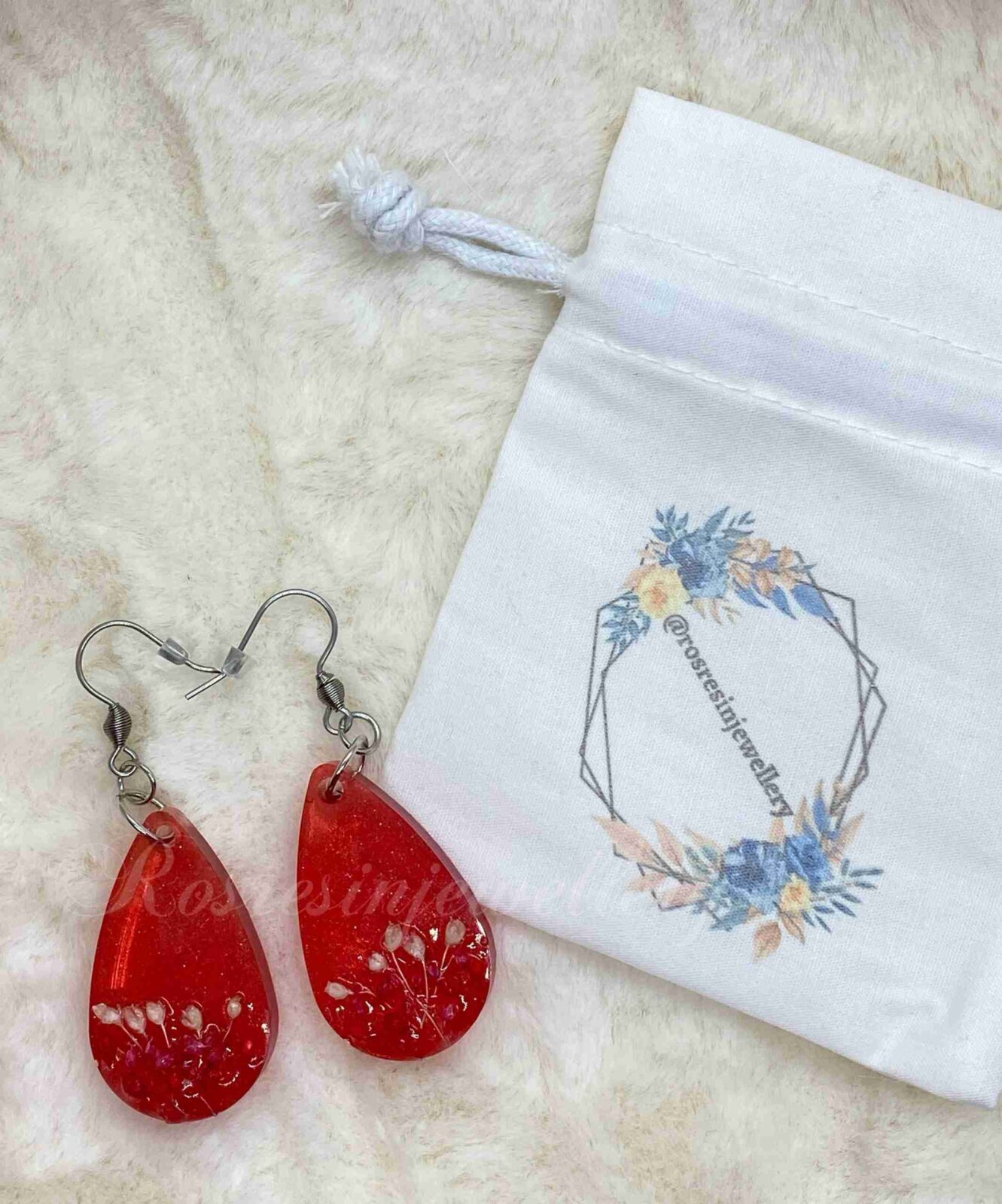 Orecchini in resina rosso con fiori inglobati in superficie per un vero effetto 3D.