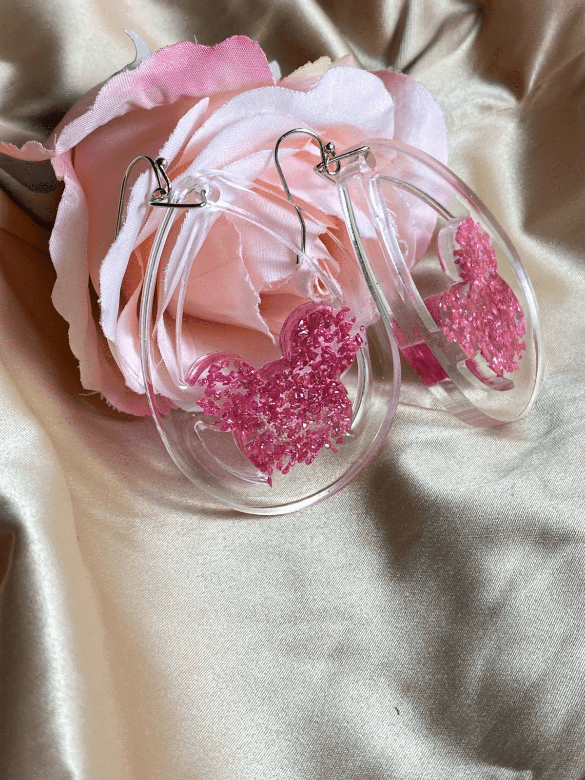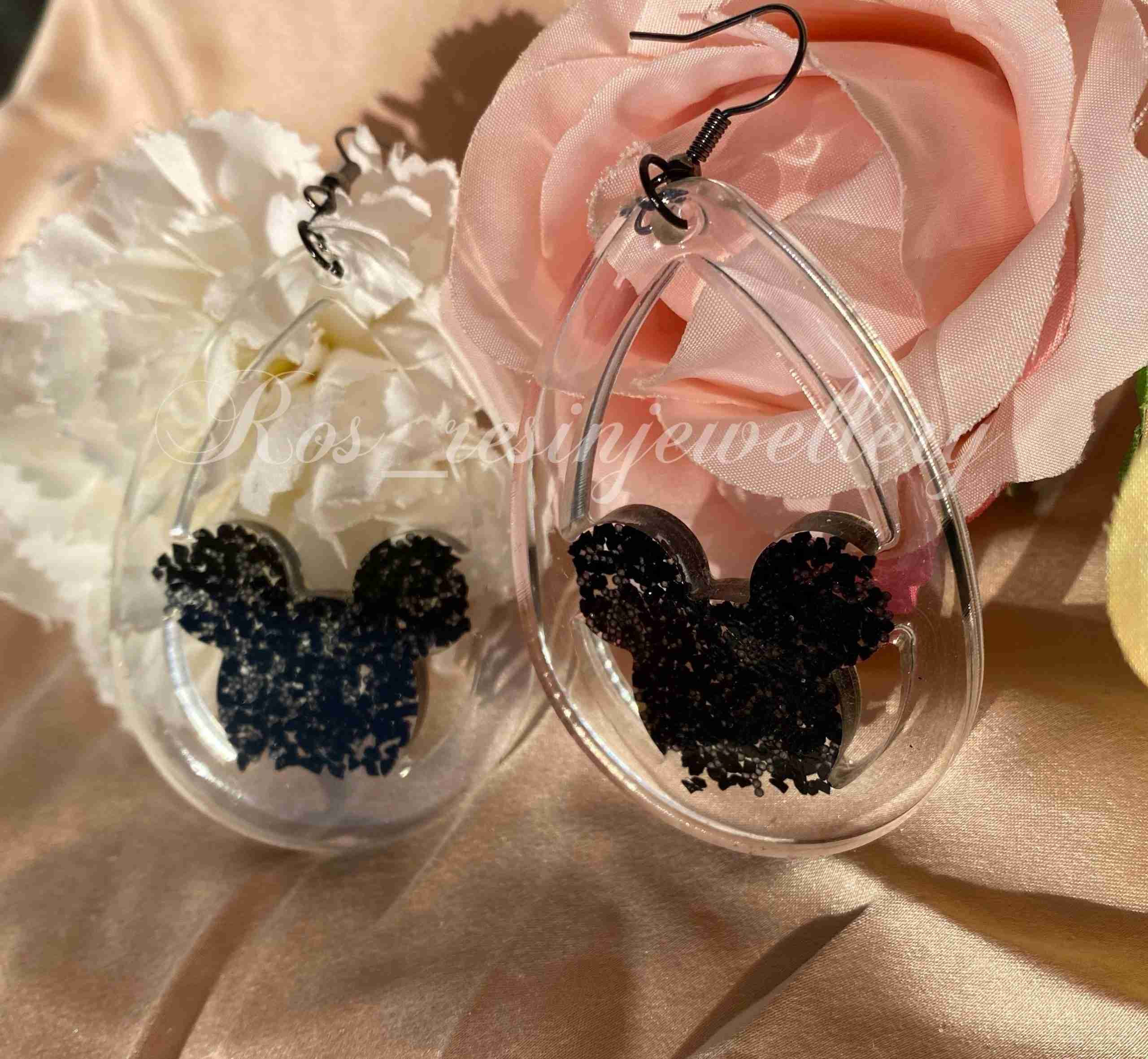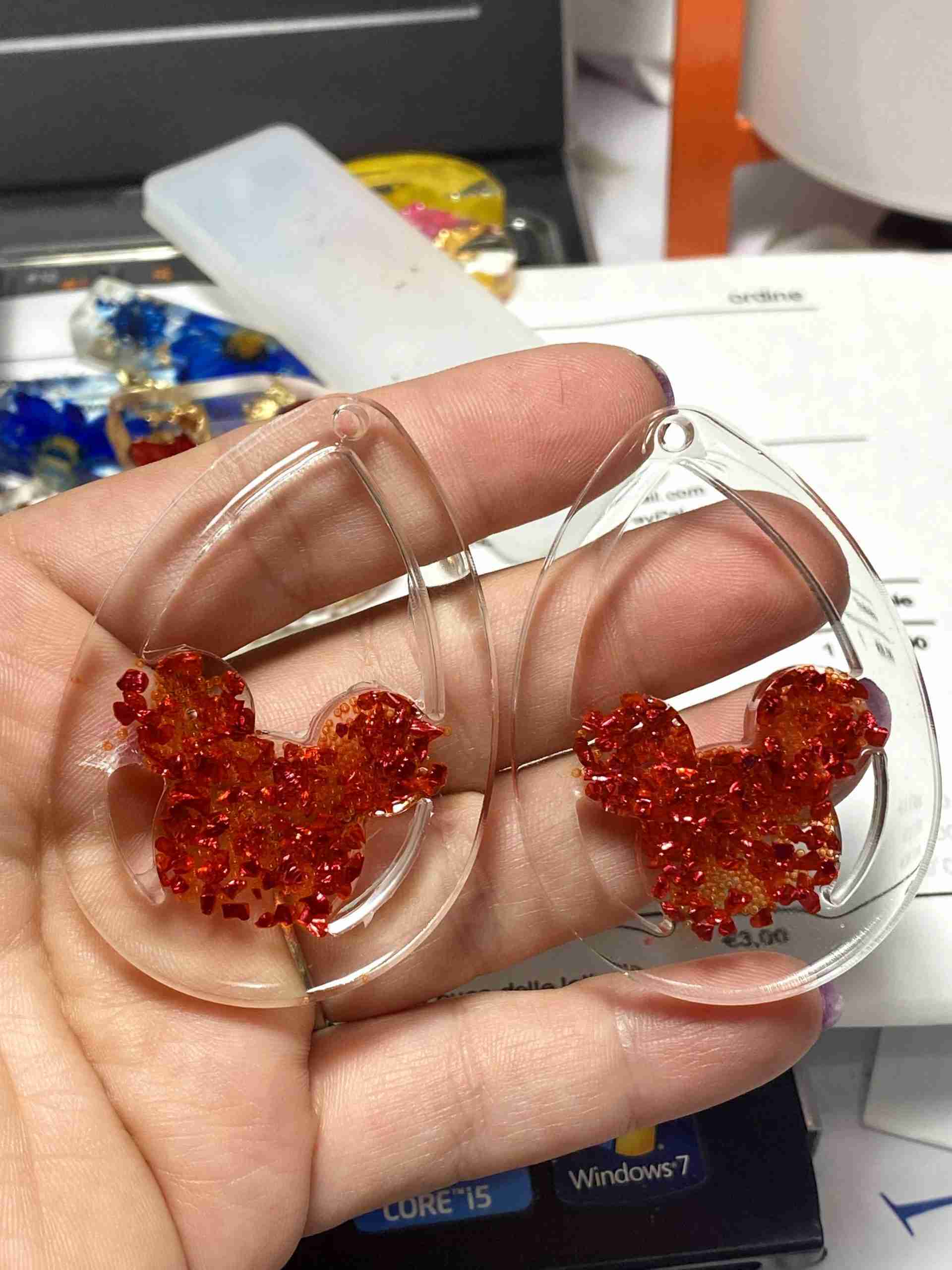 Orecchini pendenti in resina con Topolino centrale ricreato con scaglie e microperle colorate e contorno trasparente effetto vetro!!!