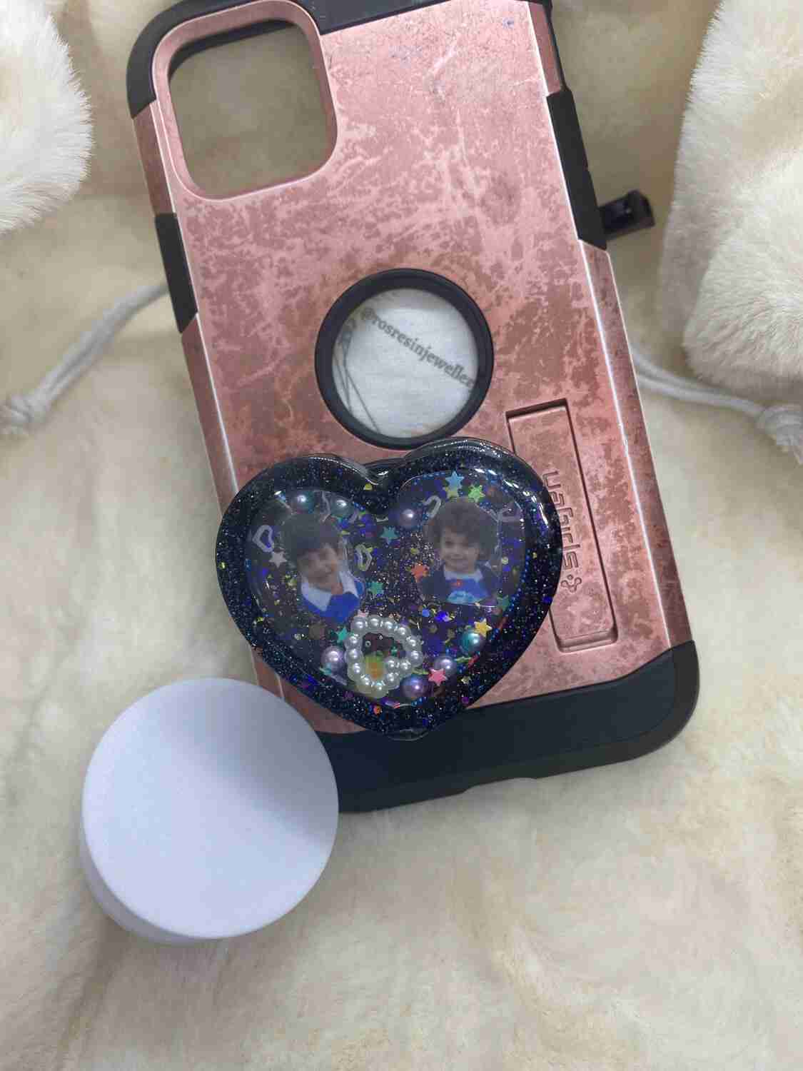 Supporto per telefono pop socket shaker in resina con all’interno glitter, adesivi, ciondoli e altri cabochon scintillanti.