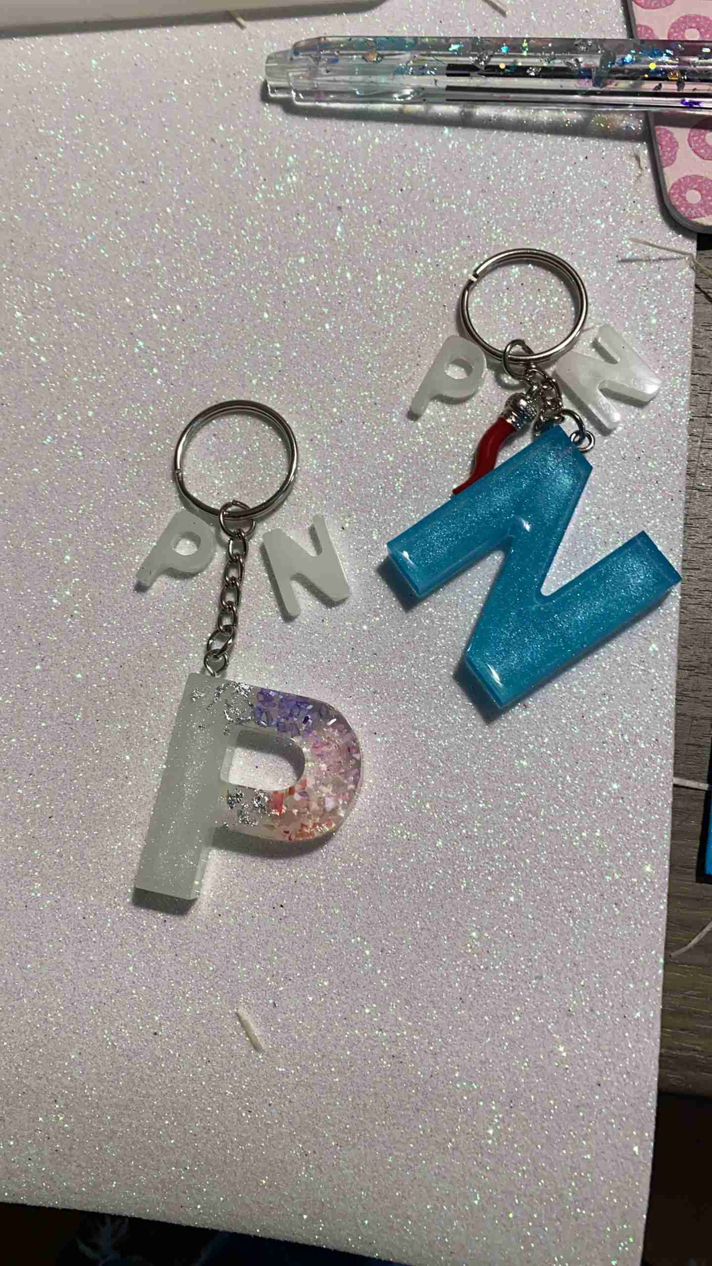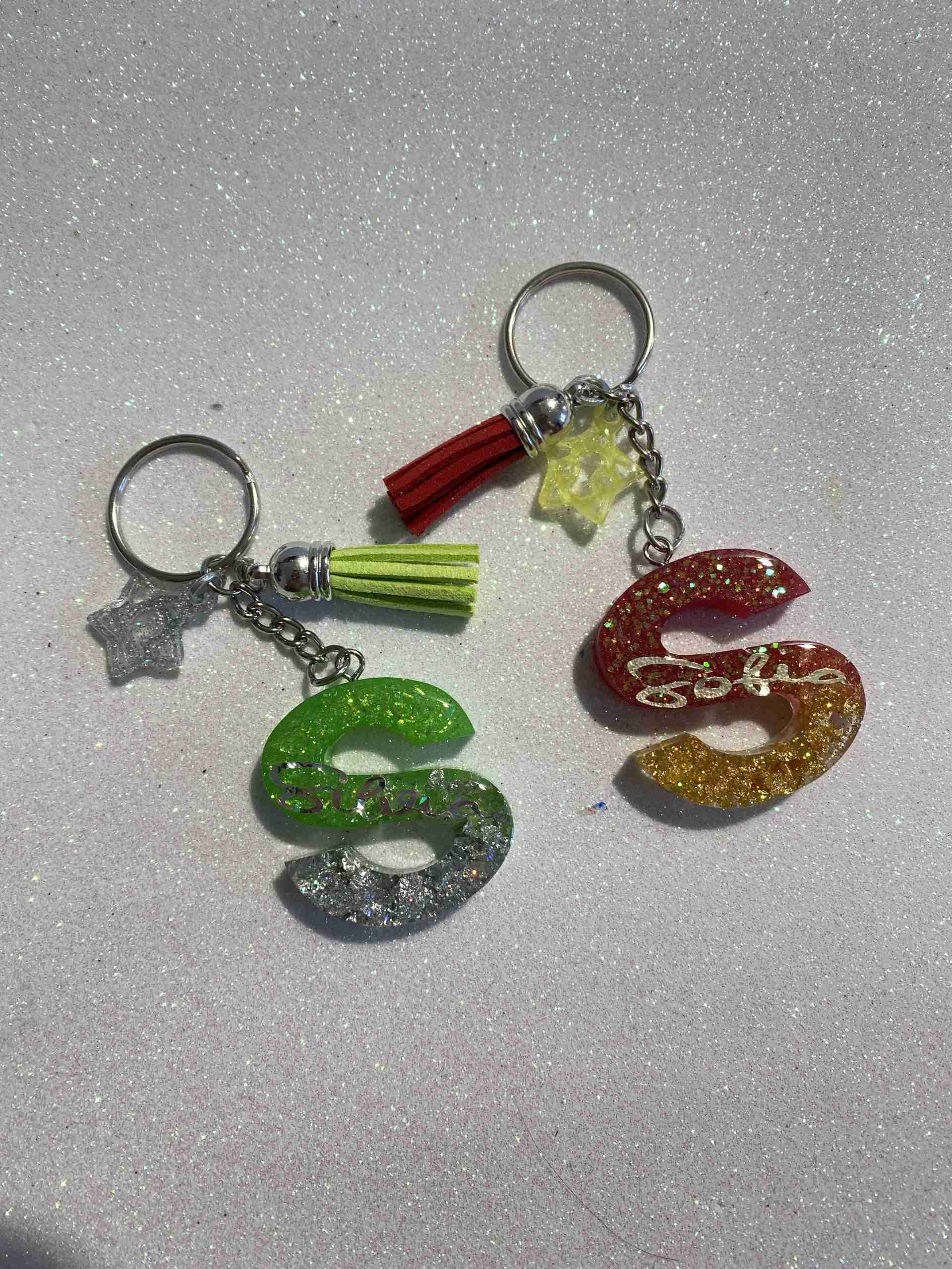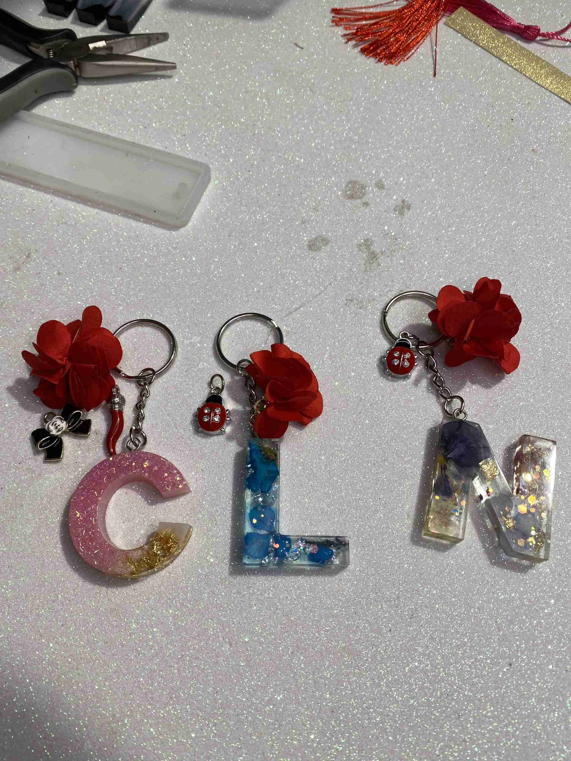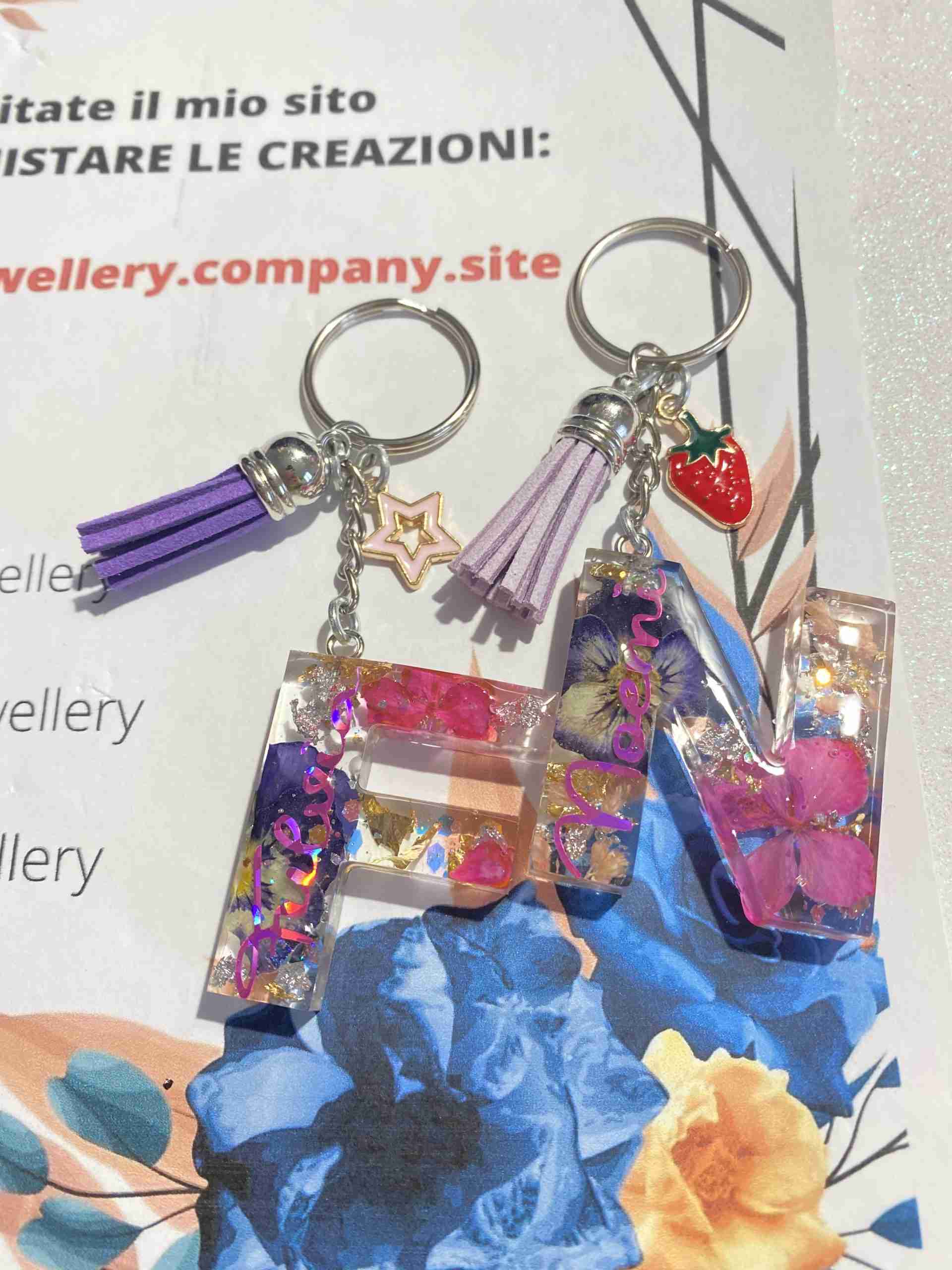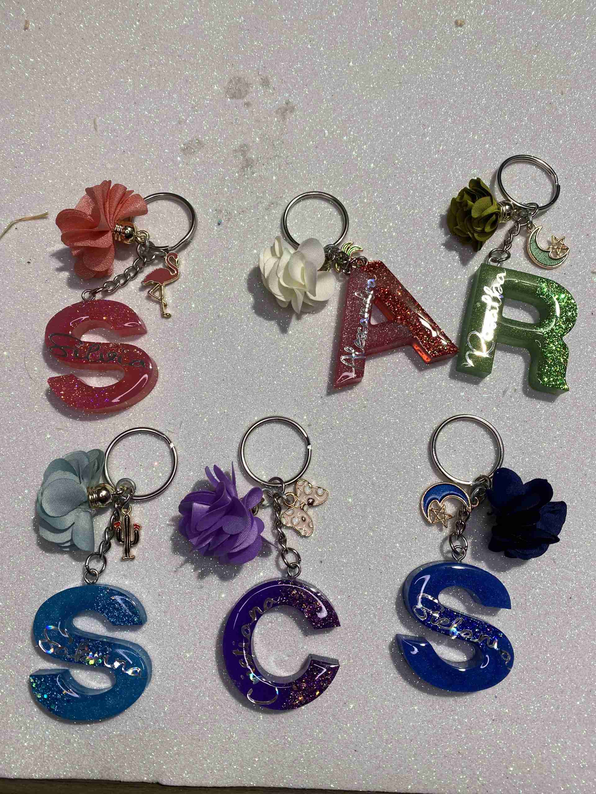 Portachiavi iniziali in resina, possibilità di personalizzarli con qualsiasi colore, glitter, fiori, ciondoli e nappine e scritte adesive.