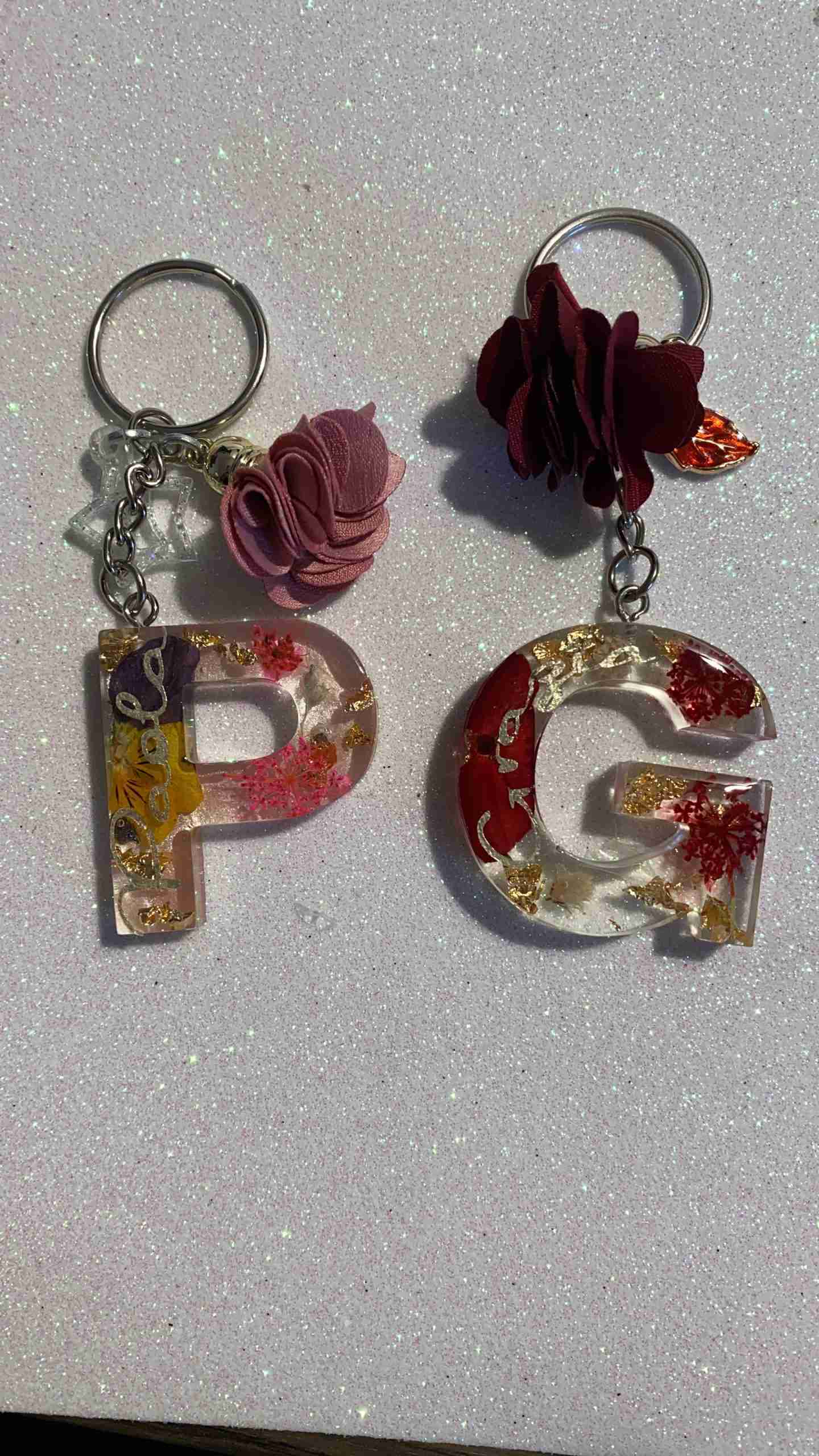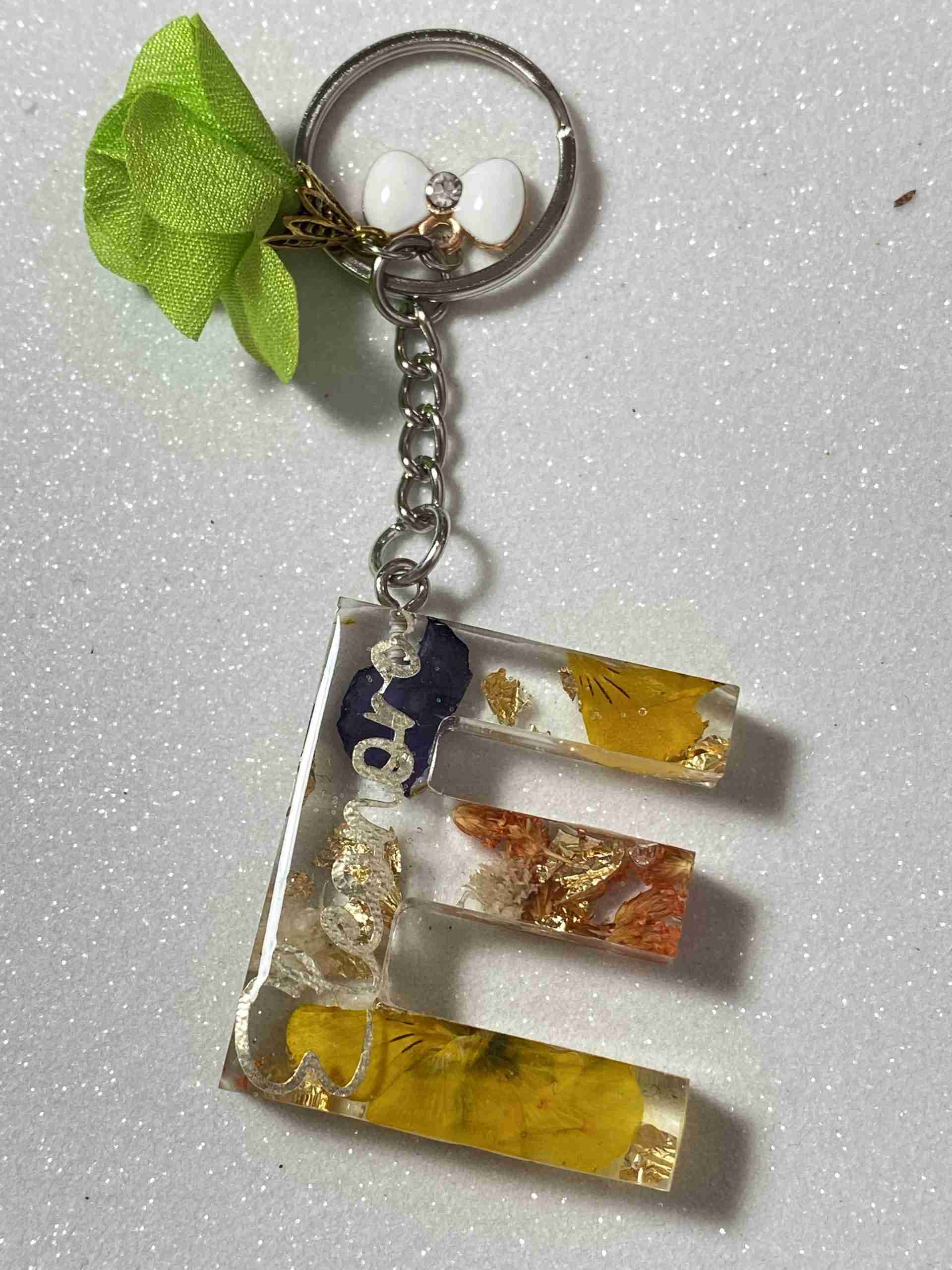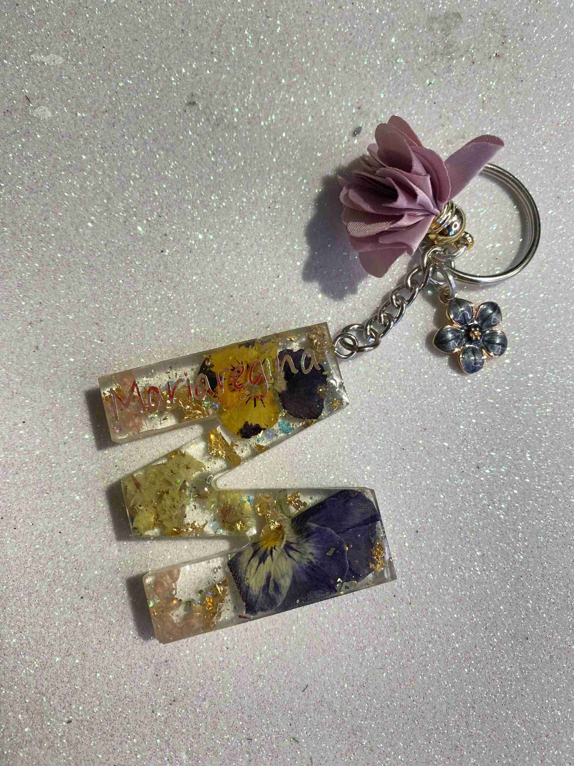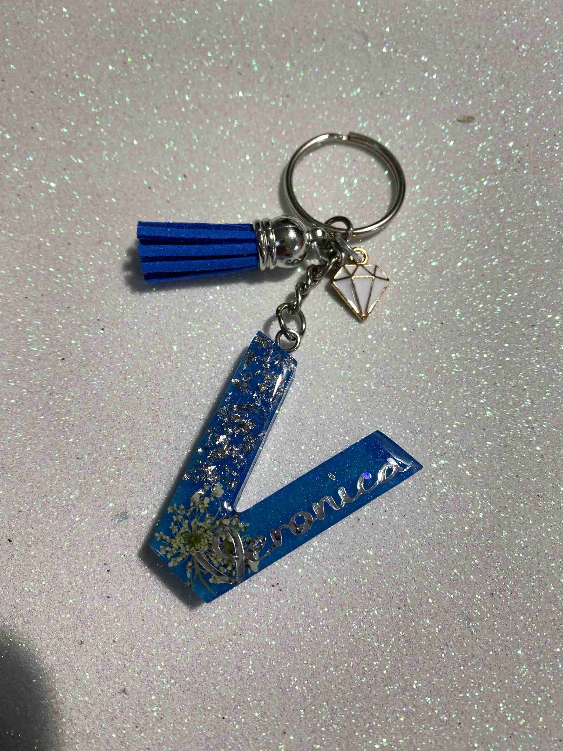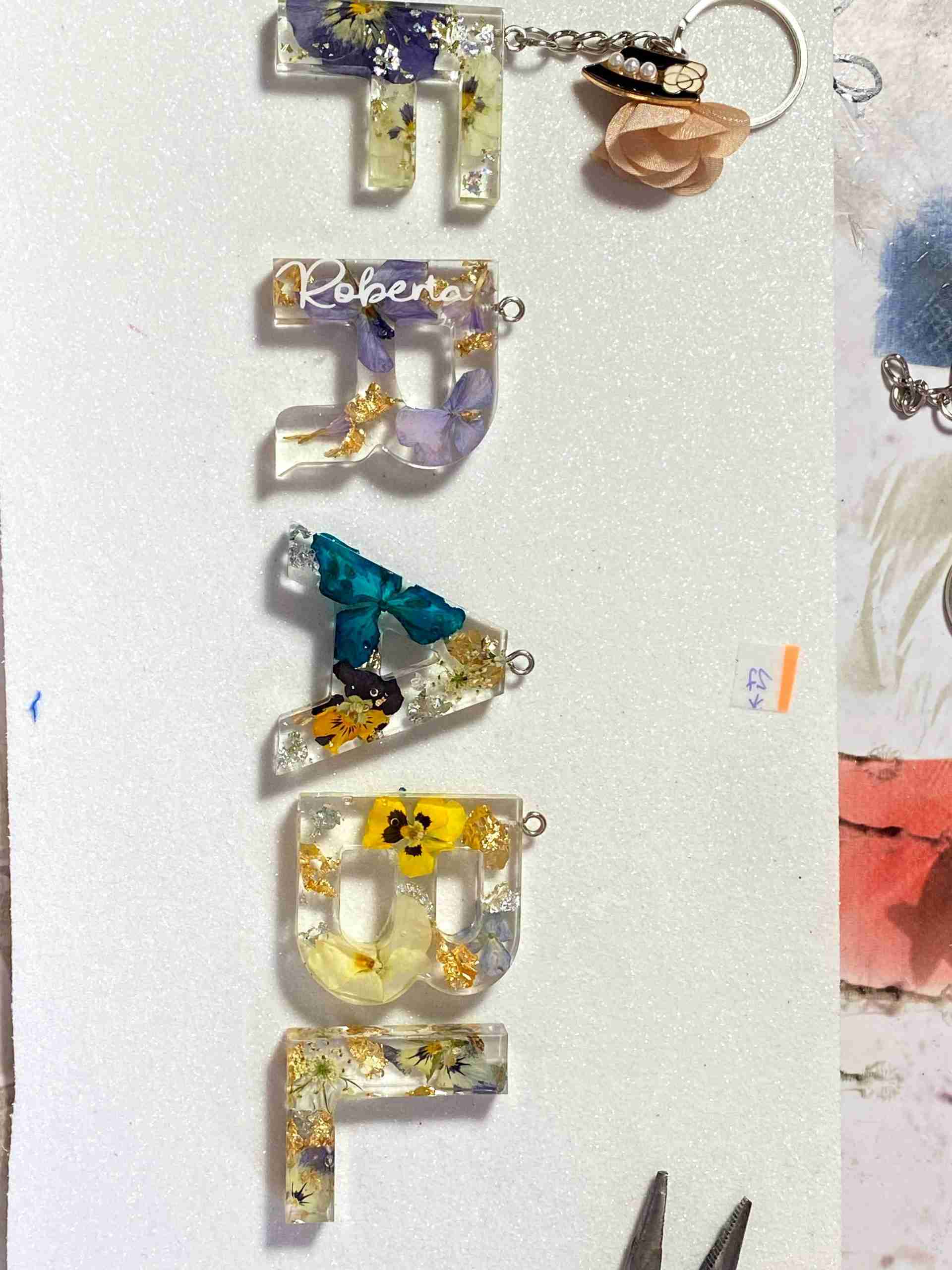 Portachiavi iniziali in resina, possibilità di personalizzarli con qualsiasi colore, glitter, fiori, ciondoli e nappine e scritte adesive.