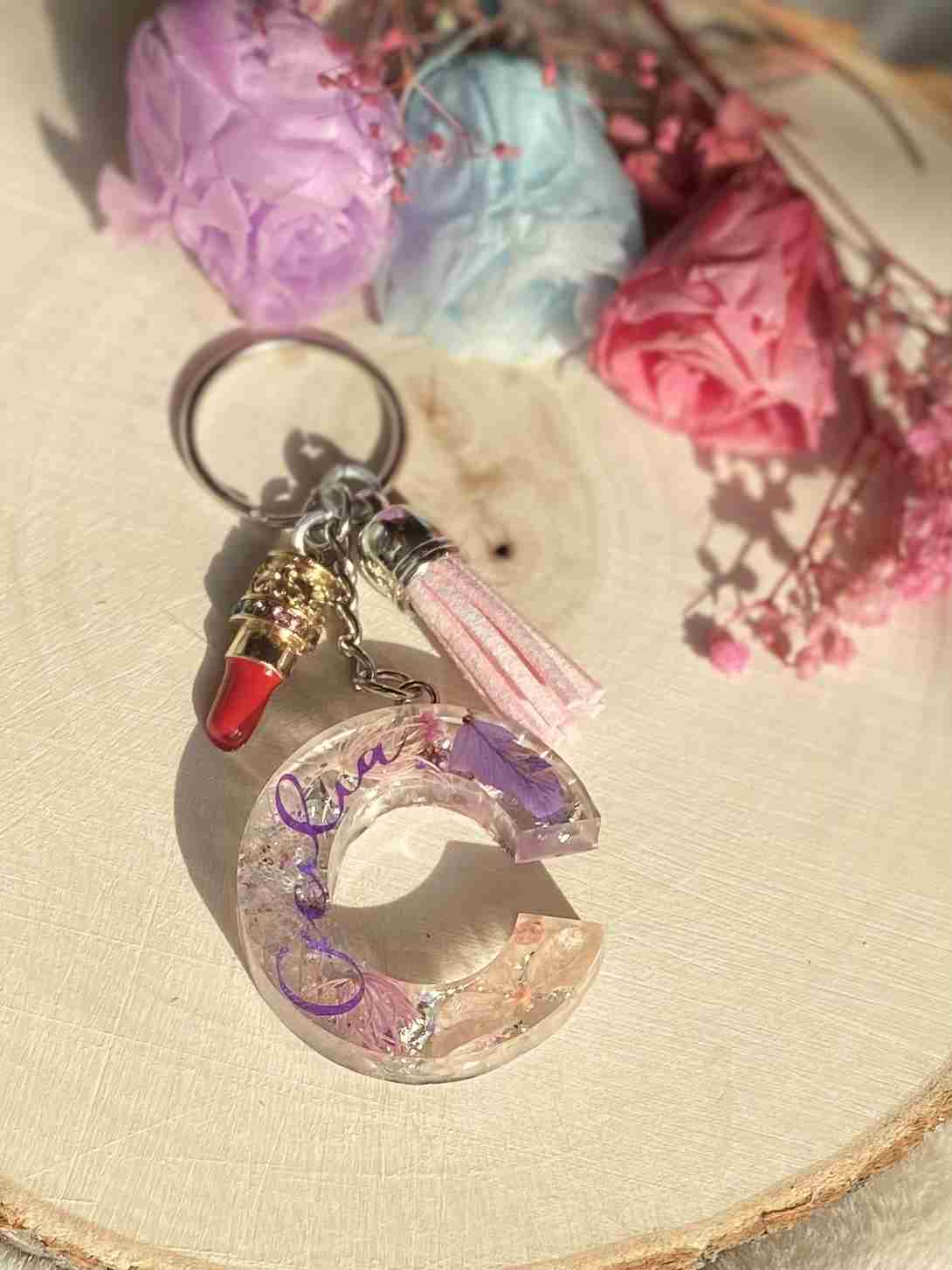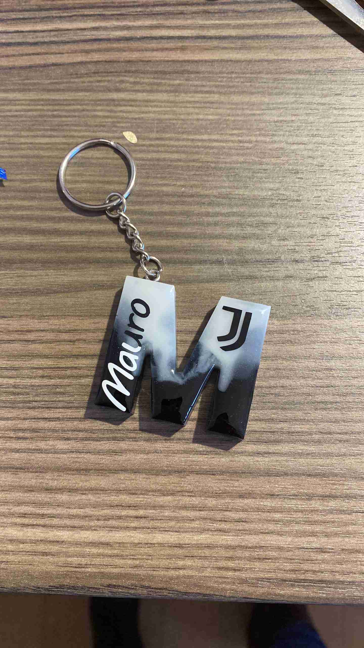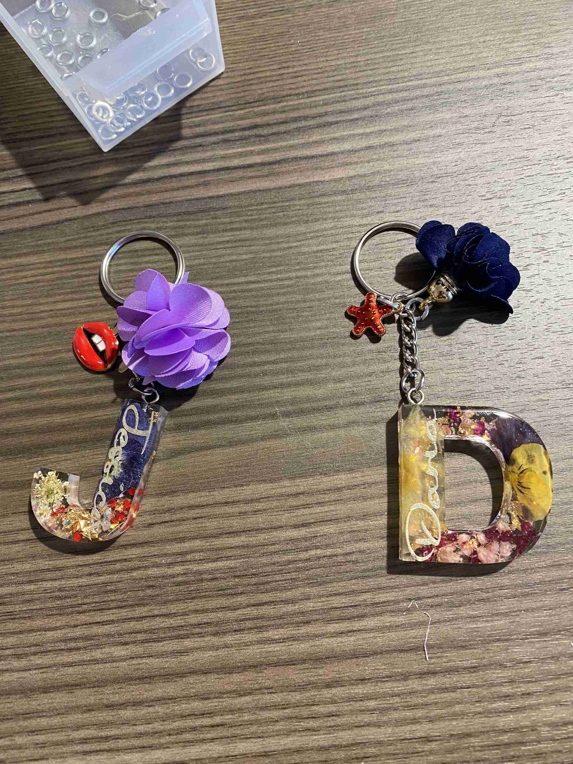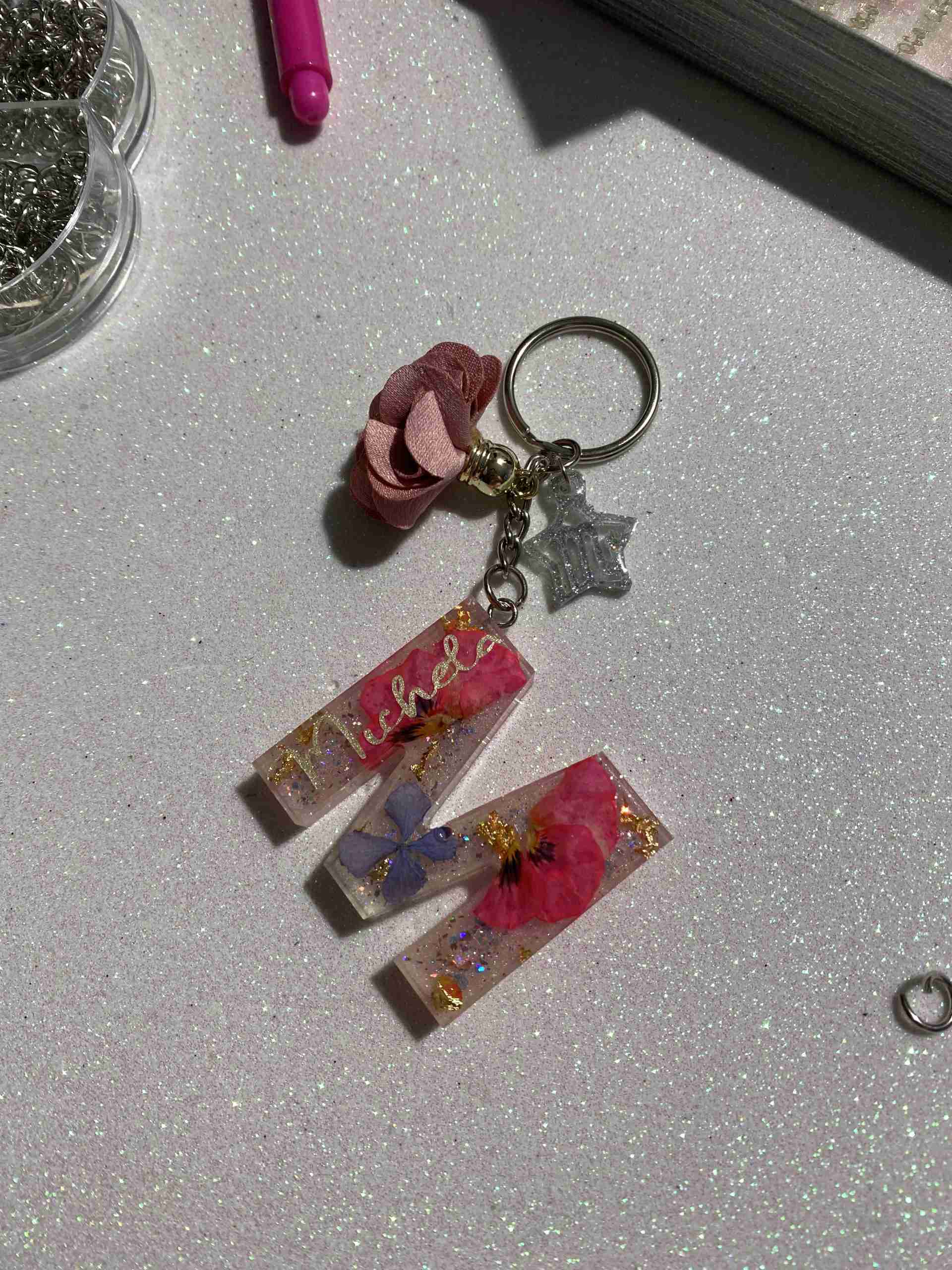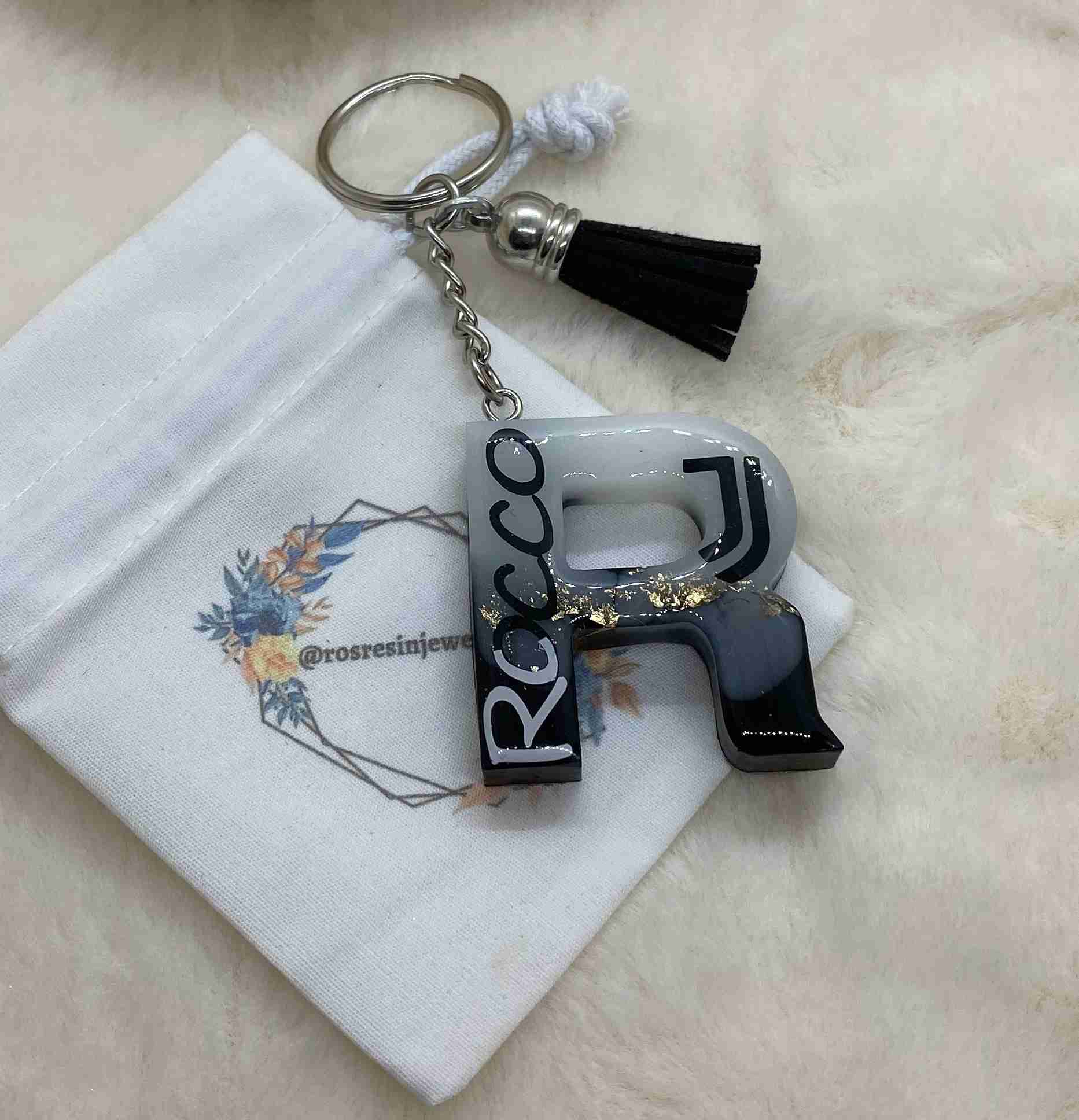 Portachiavi iniziali in resina, possibilità di personalizzarli con qualsiasi colore, glitter, fiori, ciondoli e nappine e scritte adesive.
